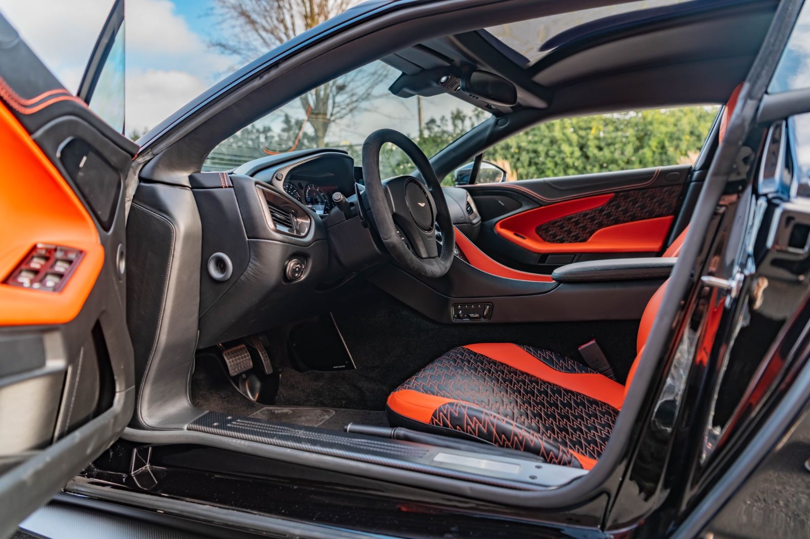 The Shooting Brake is still a strict two-seater, but one conceived as an individual and exceptionally practical GT. The extended roof on the concept sketch bears the iconic Zagato ‘double-bubble’ surfacing complete with glass inlays to let light flood into the cockpit. The sculptural roof culminates in a powered tailgate that opens onto a luxuriously trimmed rear cabin area, complete with a tailored luggage set. With dramatic herringbone carbon fibre facia with anodised bronze rotary controls, extensive ‘Z’ motif quilting and the option of a fully aniline leather upholstery, the Shooting Brake is a fitting complement to the Coupe, Volante and Speedster.