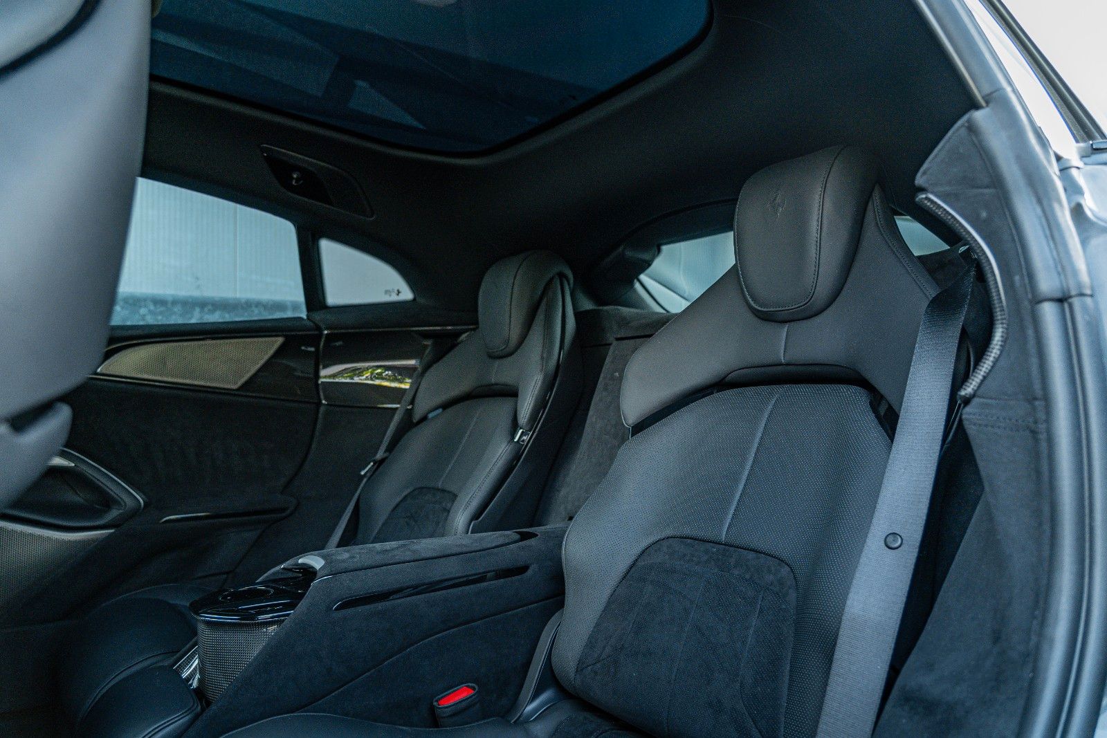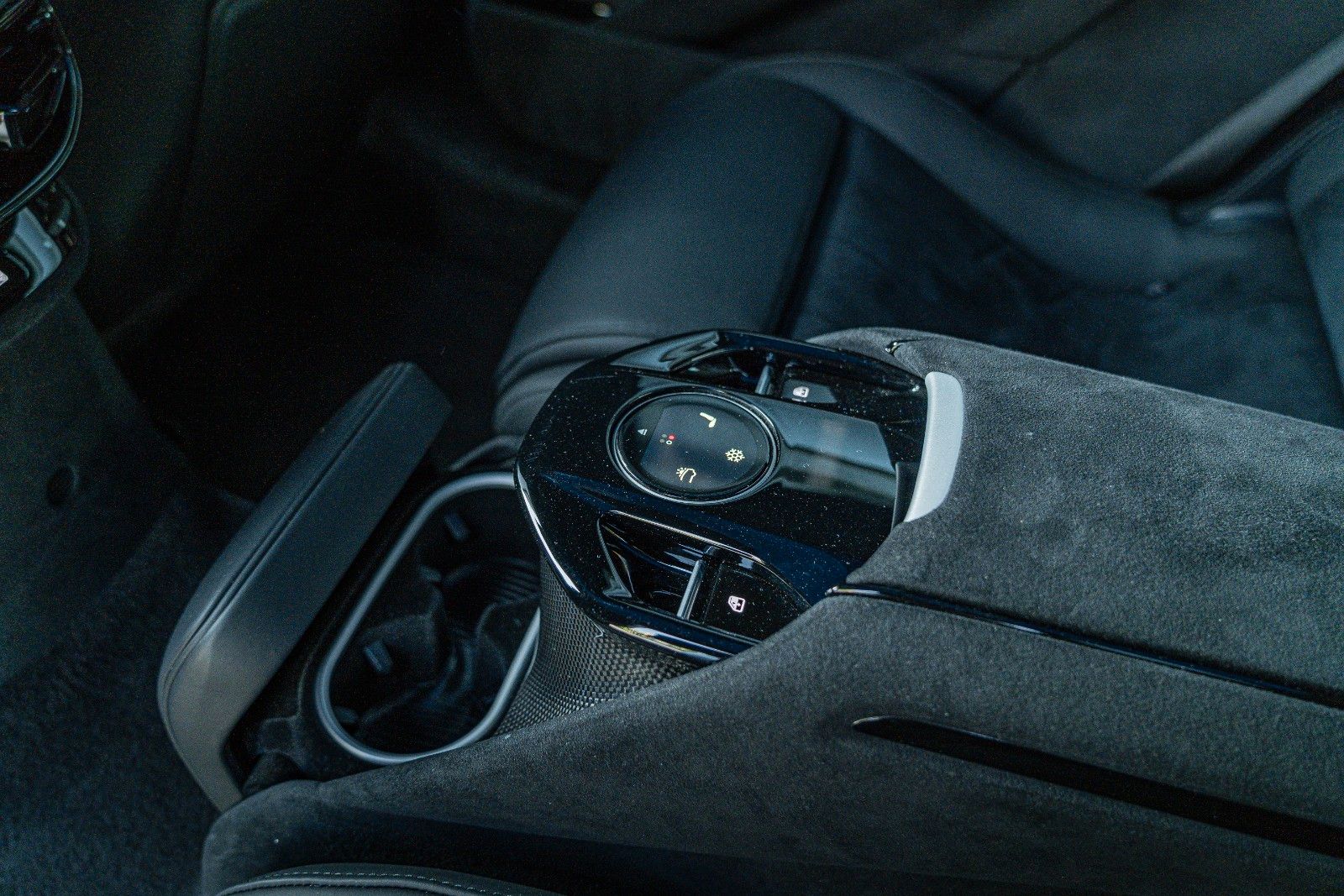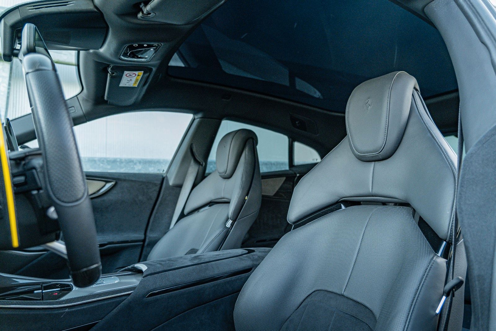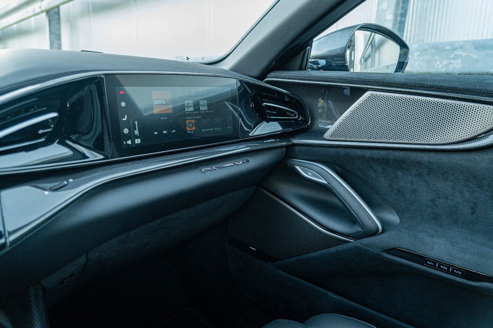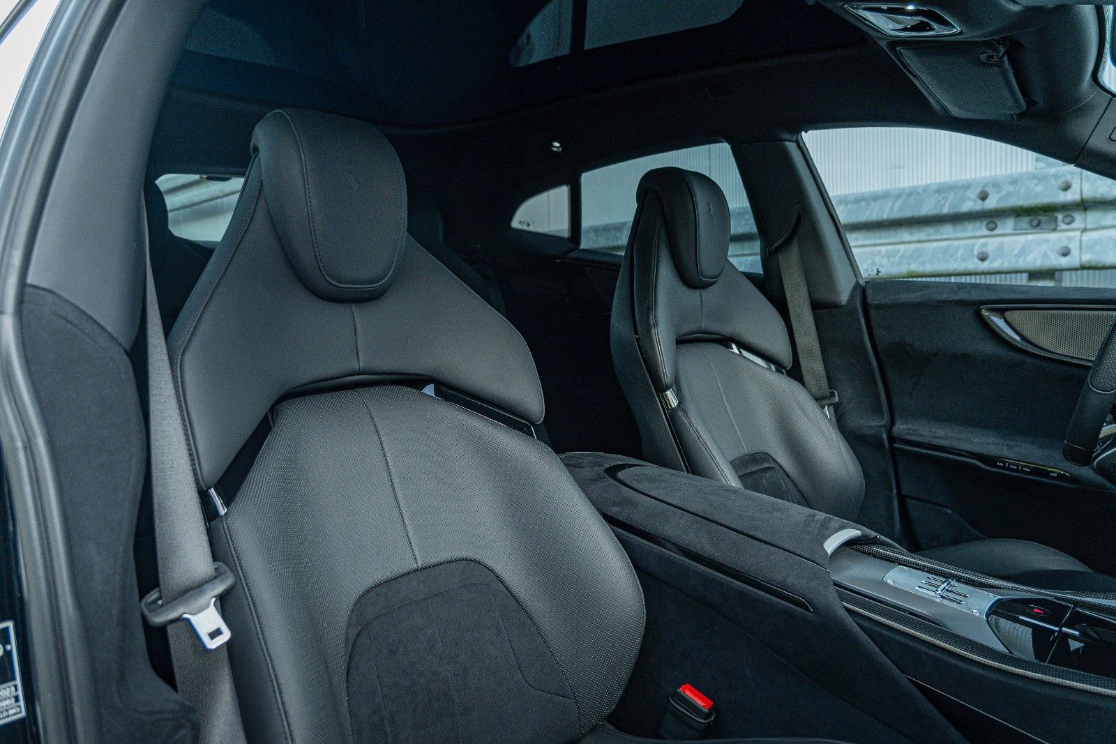 The specification is extensive and focused on both performance and luxury, featuring a comprehensive carbon fibre package (exterior and interior), panoramic roof, ventilated and massaging seats front and rear, advanced driver assistance systems, surround view camera, digital rear-view mirror, and a high-end audio system.