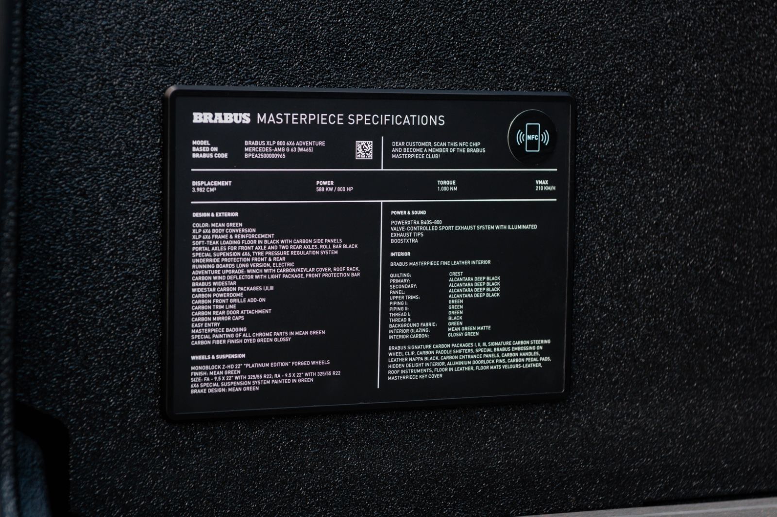 This BRABUS 800 XLP 6x6 Adventure is a truly unique BRABUS Masterpiece. Based off the new Mercedes-Benz G 63 AMG W465 model (2025), this is the first 'new-model' BRABUS XLP 6x6. Built specifically in the BRABUS 'Mean Green' specification, this beast shows beautiful custom Deep Green BRABUS Paintwork in combination with a full Carbon Fibre Package (exterior and interior), with Deep Green carbon fibre elements!